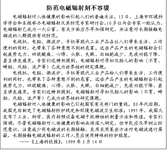 我們希望政府及有關(guān)職能部門采取切實措施,組織一些有關(guān)電磁知識的宣傳活動,讓人們在利用電磁波的同時清醒的意識到電磁波的危害,增強自我防護意識。如果需要,我們中學(xué)生愿意成為電磁輻射的義務(wù)宣傳員。具體措施如下: